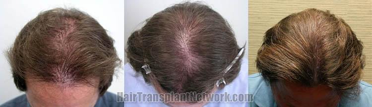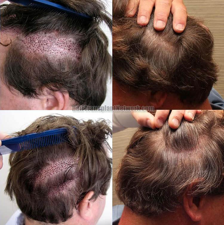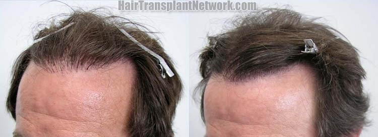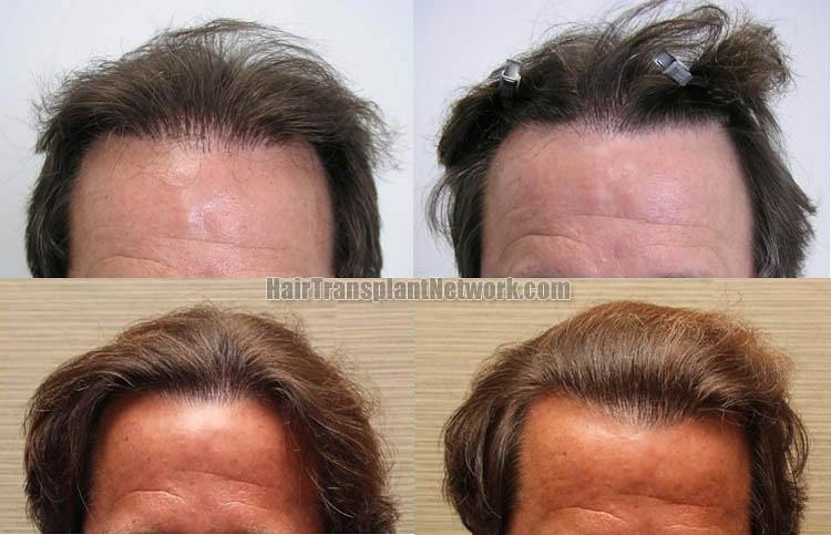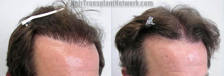 This patient goes back a few years with us. Prior to our intervention, he had undergone a few treatments in the late 80’s & early 90’s with an outside provider that was using standard punch grafts and mini grafts at the time.As evidenced by the photos, his result was not natural, the hairline being pluggy and too vertical in orientation. He also had open donor areas as well as wide strip scars on the right and left sides.Dr. True initially did two mini-strip sessions - smaller due to the extensive scarring from the previous surgeries elsewhere. At the same time, FUE was used to to thin the punch grafts. 2708 grafts were place into the interior of the hairline and central front/top.Dr. True then made the necessary transition to pure FUE harvesting with focus on softening the hairline edge and adding to the forelock region. Hair was also added to the donor area to improve the strip scars from the treatments the patient had before us. Ultimately 2 FUE sessions totaling 1674 grafts were performed. Overall, @8300 hairs were transplanted to achieve a more acceptable and natural appearance for this patient.